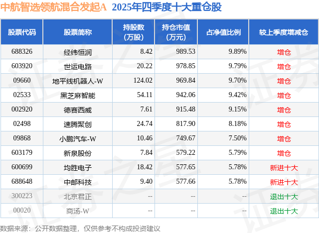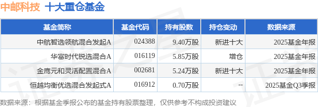 根据2025基金年报公募基金重仓股数据,重仓该股的公募基金共3家,其中持有数量最多的公募基金为中航基金的中航智选领航混合发起A。中航智选领航混合发起A目前规模为0.47亿元,最新净值0.8833(4月7日),较上一交易日下跌0.26%。该公募基金现任基金经理为王森 郑常斌。王森在任的基金产品包括:中航恒宇港股通价值优选混合发起A,管理时间为2023年9月27日至今,期间收益率为33.07%;中航趋势领航混合发起A,管理时间为2024年6月18日至今,期间收益率为136.6%;中航远见领航混合发起A,管理时间为2024年8月30日至今,期间收益率为15.58%;中航优选领航混合发起A,管理时间为2024年12月24日至今,期间收益率为83.38%。