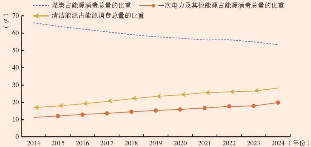 2014年以来,在习“推动能源消费革命,抑制不合理能源消费”的指示下,节能已经逐渐成为我国能源消费利用的优先方针,加快促进我国用能方式向集约高效型转变。据国家统计局数据测算,按照2010年可比价格,2014—2024年,我国万元GDP能源消费量从0.66吨标准煤下降至0.46吨标准煤,以年均3.37%的能源消费总量增速支撑了年均7.25%的国内生产总值增长,成为全球能耗强度下降最快的国家之一。能源结构加快调整,煤炭消费持续下降,清洁能源消费逐年增多,电气化率稳步提升。如图1所示,2014年,煤炭在我国能源消费总量中的比重为65.8%,清洁能源消费占比为16.9%,一次电力及其他能源占比为11.3%;2024年,煤炭消费占比下降至53.2%,清洁能源消费占比上升至28.6%,一次电力及其他能源占比超过18%,电气化率加快提升,预计2025年会提高到31.2%。减污降碳改造持续走实走深,重点领域和行业的能效水平不断提高,排放强度持续下降。重点耗能工业企业单位电石、单位合成氨、吨钢、单位电解铝综合能耗分别下降0.8%、1.2%、0.1%、0.2%(国家统计局,2024)。自2014年提出《煤电节能减排升级与改造行动计划(2014—2020年)》以来,截至2023年底,共改造10.3亿千瓦煤电,累计95%以上的煤电机组已经实现超低排放。随着《煤电低碳化改造建设行动方案(2024—2027年)》的实施,煤电的减污降碳改造升级进一步深化,推动排放强度持续下降。2024年每千瓦时火力发电标准煤耗下降0.2%。据国家统计局测算,万元GDP二氧化碳排放已多年下降,2024年比2023年下降3.4%。