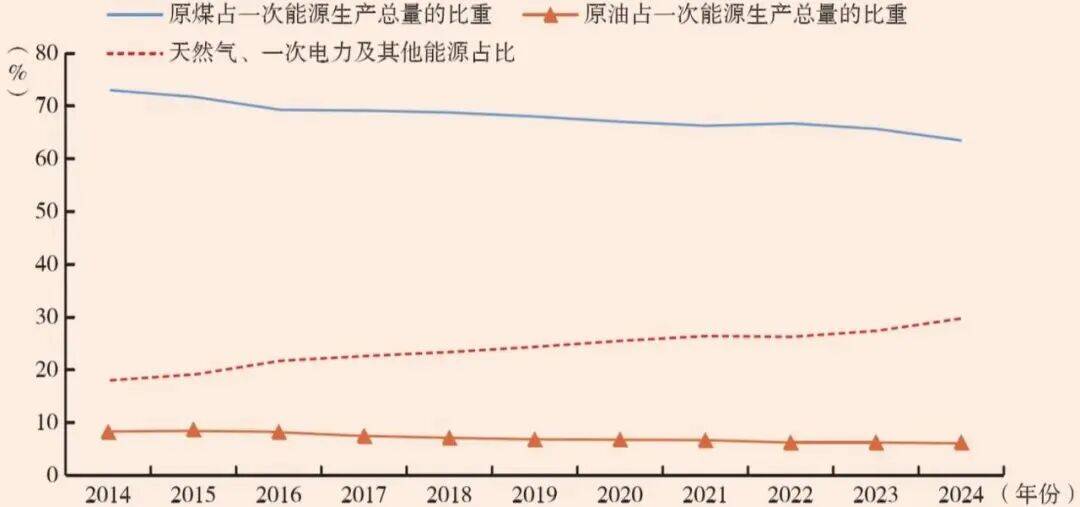 在能源保障能力持续提升的同时,供给结构更加清洁低碳。2014—2024年,原煤、原油占一次能源生产总量的比重稳定下降,分别从73.5%、8.3%下降至63.9%、6.1%;天然气、一次电力及其他能源的占比持续提高,从18.2%增长至30%;煤电机组改造升级持续推进,2024年,煤电机组淘汰产能超800万千瓦,改造升级1.8亿千瓦;清洁能源发电占比不断提高,规模以上工业水电、核电、太阳能发电和风电占比已提高至32.6%,全国已建成投运新型储能项目累计装机1.68亿千瓦时。能源供给智能化水平稳定提高,供给体系更加高效。如智能化煤炭产能比重已经超过五成,大中型煤矿原煤生产综合能耗已下降至2023年的9千克标煤/吨,发电机电站供热总效率从2014年的43.5%增长至2022年的47.9%(袁惊柱,2025)。