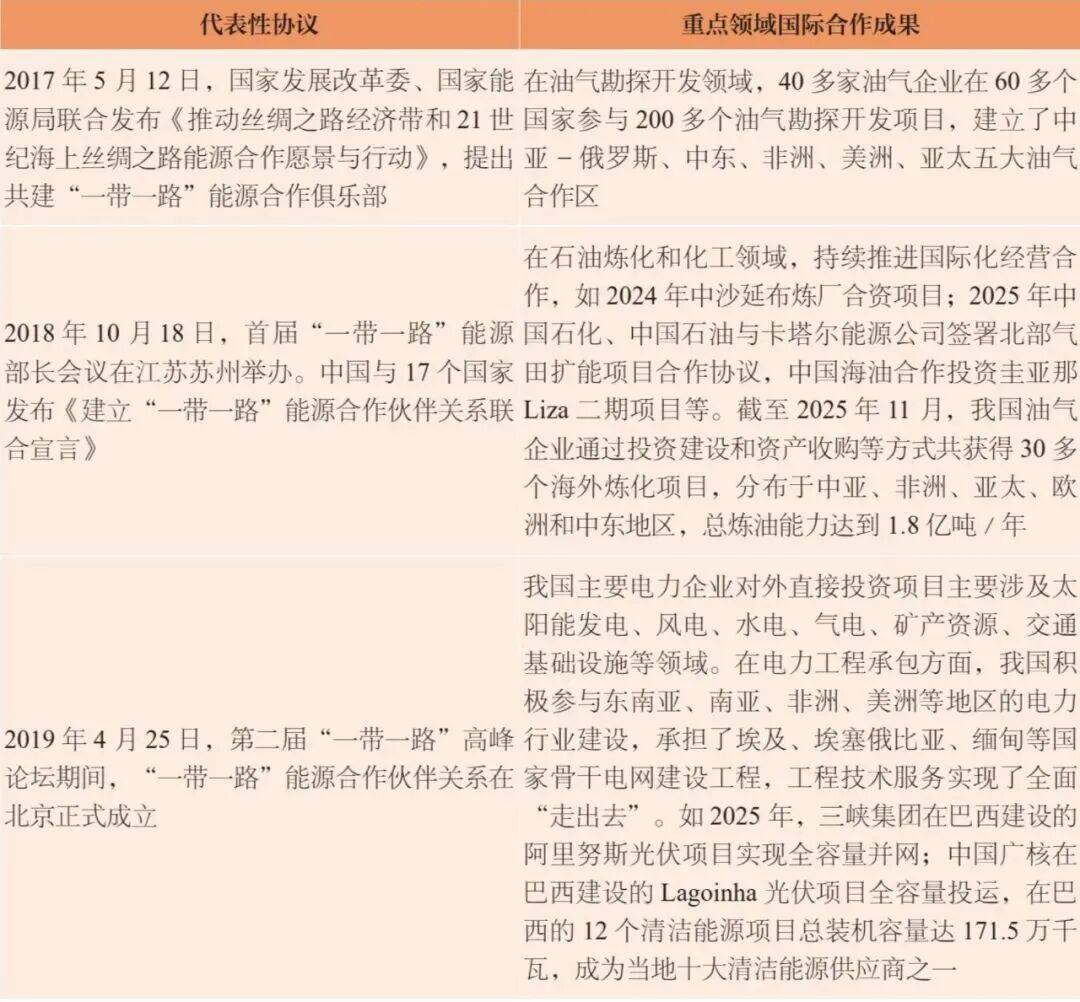 在习“要全方位加强国际合作,实现开放条件下能源安全”的引领下,我国始终秉持共商共建共享的原则,共同促进全球能源可持续发展,并积极参与全球能源治理体系建设。将能源合作作为共建“一带一路”的重点领域,并为能源国际合作打造市场化、法治化和国际化的营商环境。中国先后与东盟等6大区域搭建能源合作平台,与34个国家建立“一带一路”能源合作伙伴关系,与90多个国家和地区建立政府间能源合作机制,与10多个国家和地区开展双边能源合作规划,与30多个能源类国际组织、多边机制建立合作关系(肖新建,2023;国务院新闻办公室,2025)。油气基础设施互联互通、与周边国家电网互联互通、产能合作取得阶段性进展。积极推动能源绿色低碳转型,并加强能源治理体系建设,不断完善适应绿色低碳转型的能源标准体系建设,已基本实现能源行业各领域标准化技术委员会全覆盖,发布了系列国家标准和行业标准,并积极参与能源标准化国际合作。大力发展可再生能源,推动共建“一带一路”绿色能源合作,积极构建中国特色的“2+6+N”能源国际合作机制,已与100多个国家和地区开展了绿色能源项目合作(杨梓,2022;胡明,2025)。积极主动落实联合国2030年可持续发展议程,在应对全球气候变化挑战中积极贡献中国力量,以光伏发电、风电、锂电池、新能源汽车等大量绿色低碳能源产品设备,为全球能源转型提供了重要支撑,在提升全球能源可及性和共建人类命运共同体上发挥了中国的大国引领作用,提供了中国方案,贡献了中国智慧。