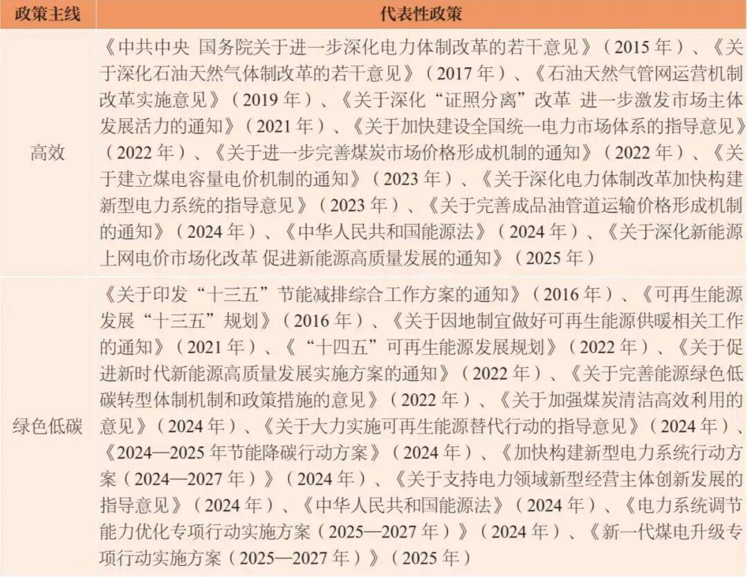在能源安全新战略框架下,我国能源政策体系围绕安全、高效、绿色低碳三条主线)。在安全方面,政策重心从解决油气供需矛盾逐渐向强化能源资源安全保障转变;在高效方面,政策重心主要以“构建现代化能源市场体系”为目标,核心在于能源价格机制改革;在绿色低碳方面,政策重心体现在化石能源清洁低碳利用和新能源高质量发展两个方面,关键在于技术创新和促进新能源健康发展。整体来看,目前我国能源政策形式更加丰富多样,包括规划、指导意见、实施方案、法律法规等;政策内容更加全面细致,不仅涵盖各细分行业,而且聚焦具体产业链环节和市场主体;政策体系更加协调统一,更加注重细分行业之间、各主线之间的政策一致性。